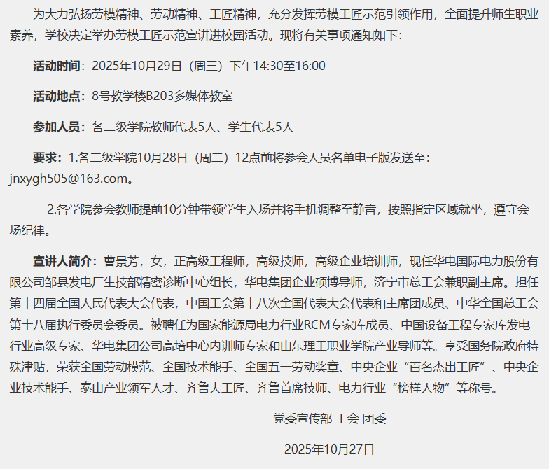 关于举办“劳模工匠进校园 同上一堂思政课”宣讲报告会的通知